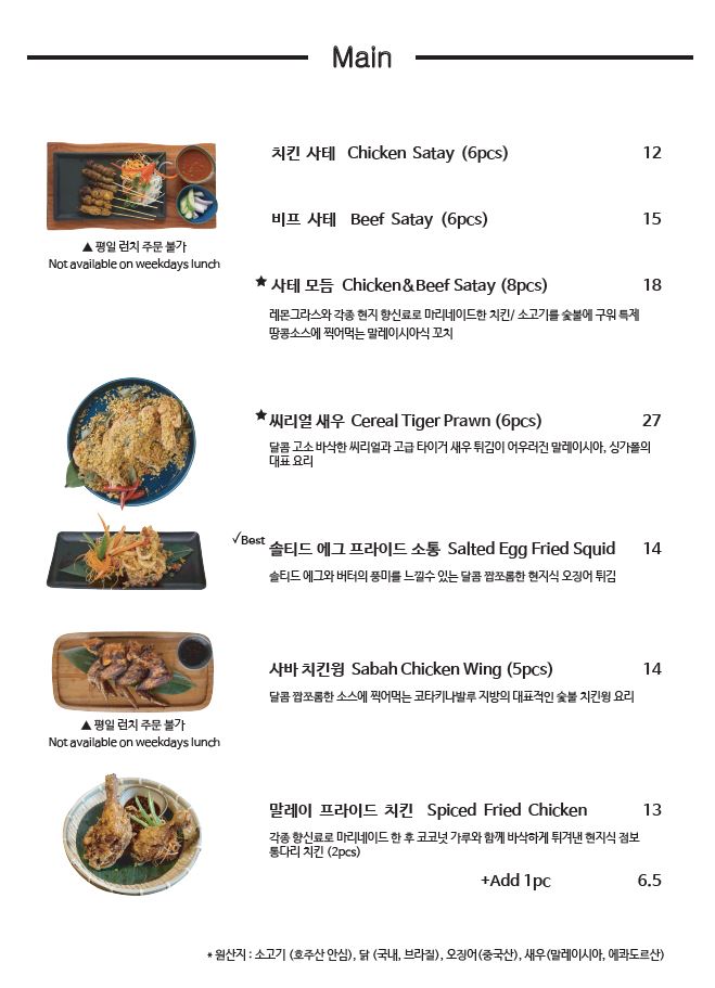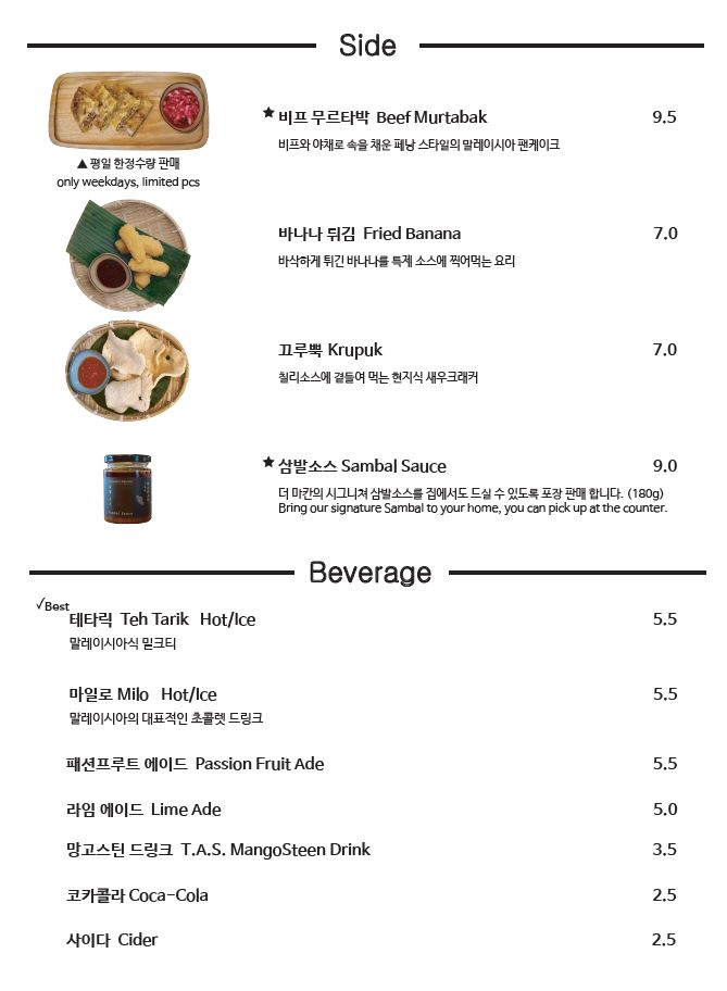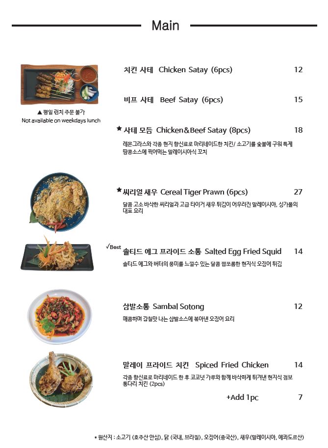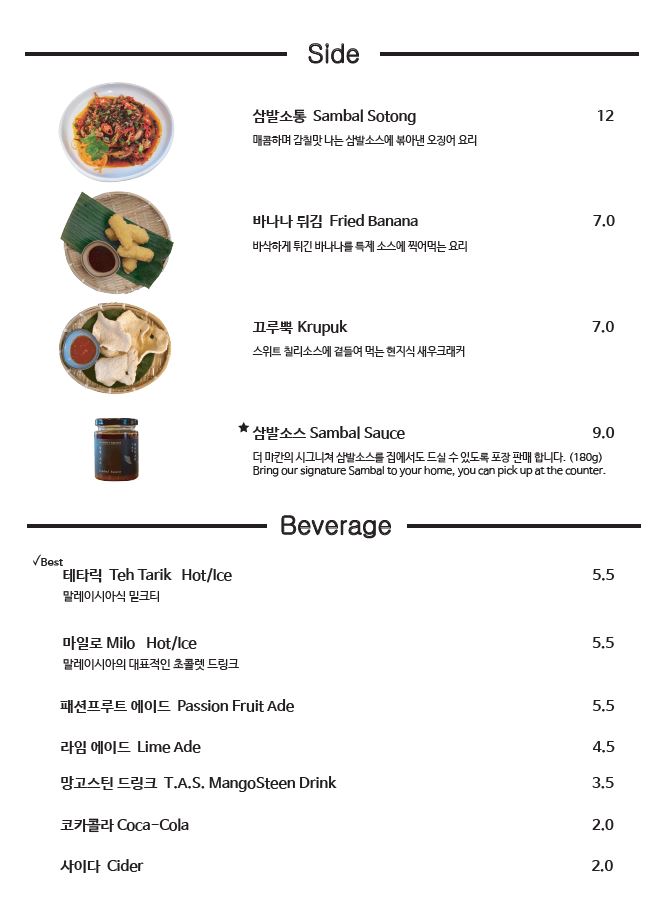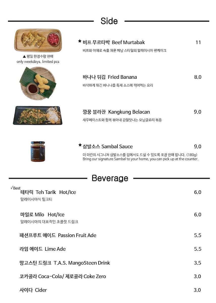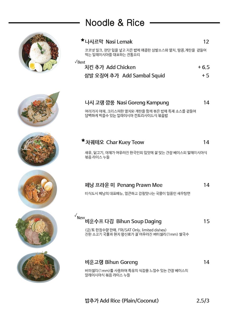 Menu highlights provide a glimpse into the variety you can expect: from staple plates like Nasi Lemak Sambal Sotong and Nasi Goreng Kampung to sharing options such as 사테모듬 (satay platter) and crispy Pisang Goreng (fried banana). Light bites and noodles, including char kuey teow and 페낭 프라운 미, pair well with thoughtfully crafted beverages like cooling Passion Fruit Ade or the smooth, frothy Teh Tarik Milk Tea. For a twist, drinks like the Lemongrass Gintonic bring a refreshing balance to the meal experience.